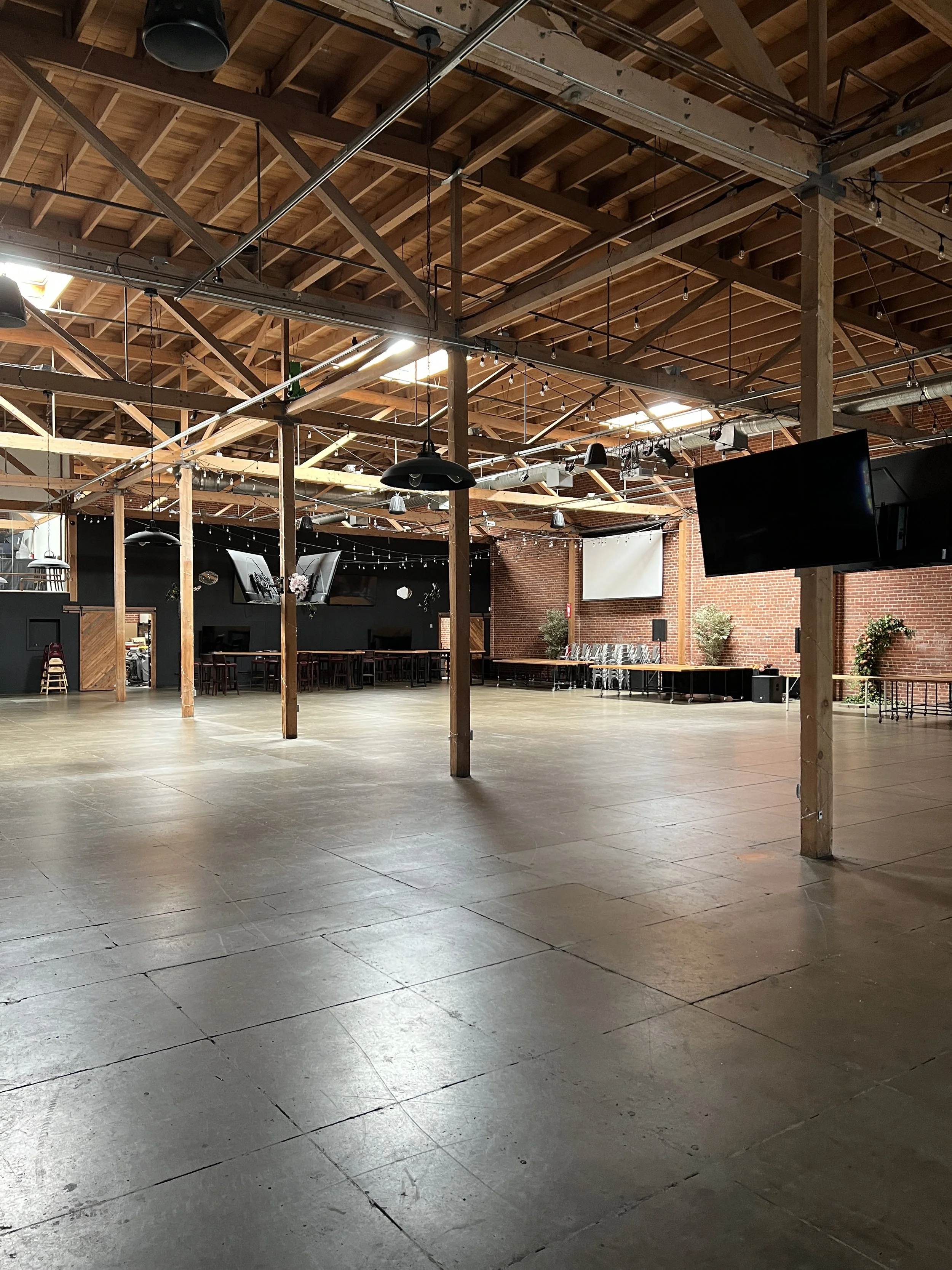 Guildhouse is a versatile 18,000 sq ft. event venue featuring a modern-industrial aesthetic where vintage materials meet modern amenities. Guildhouse features 20’ timber ceilings, brick walls, polished concrete floors and a full bar. Our robust tech infrastructure includes: a gigabit fiber backbone, mesh wifi network, 4k video distribution system, and zoned audio with wireless mics.